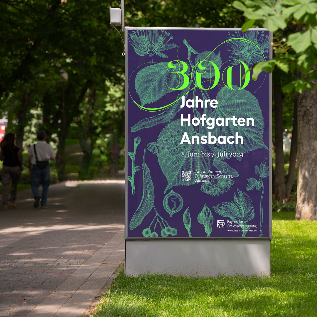 Zum Jubiläum des Hofgartens Ansbach 2024 veranstaltet die Bayerische Schlösserverwaltung ein umfangreiches Programm mit Ausstellungen, Führungen, Konzerten und Aktionen. Wir gestalteten neben Keyvisual und Kommunikationsmaßnahmen auch die Jubiläumsausstellung im Hofgarten und die Kommunikation zur Ausstellung HERBOLARIUM von Evalie Wagner im Zitrushaus.